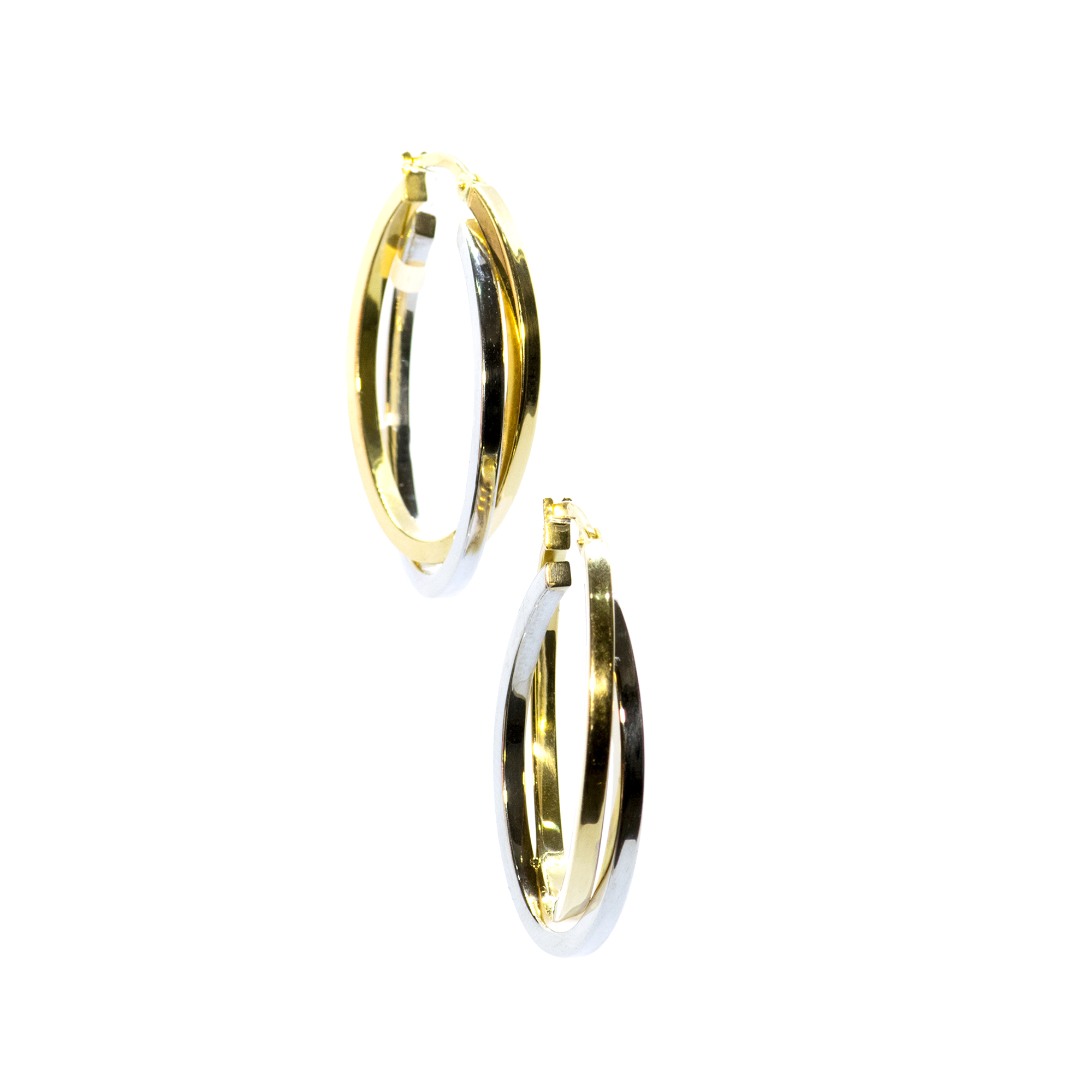 Candongas elaboradas en oro blanco y amarillo con un diseño sutil entorchado.