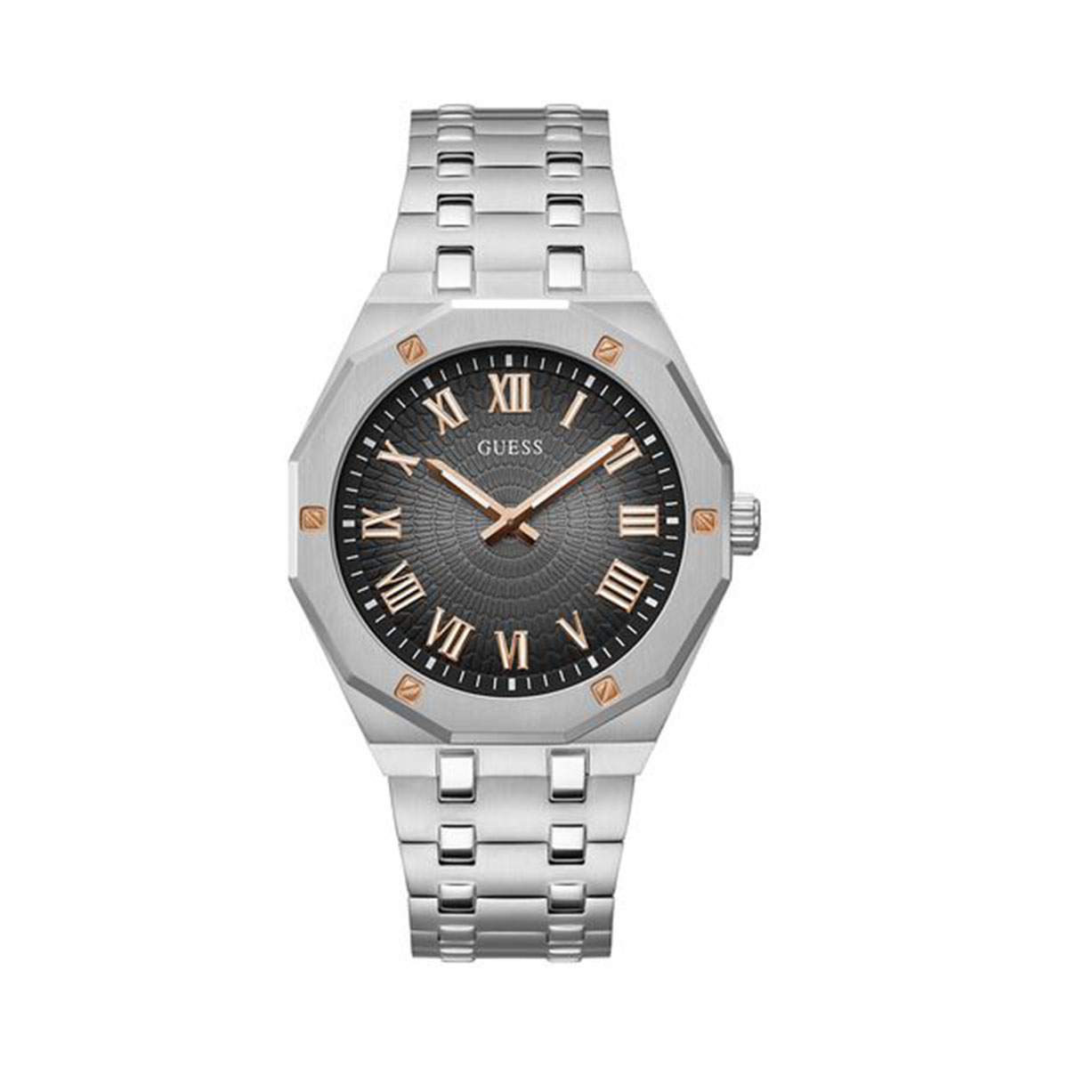 Un activo para el guardarropa de cualquier hombre, este impresionante diseño de caja octogonal con detalles de tornillos presenta un diseño de esfera de lujo con números romanos y una pulsera cepillada y pulida.