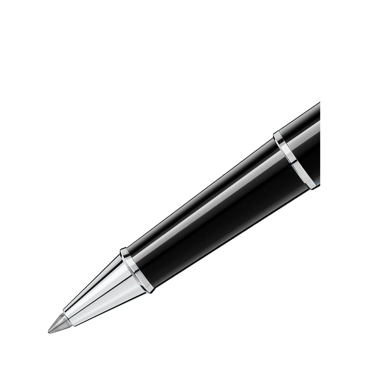 Tres anillos platinados con la marca Montblanc repujada y un clip platinado con número de serie individual realzan el diseño atemporal de este rollerball lujoso.
