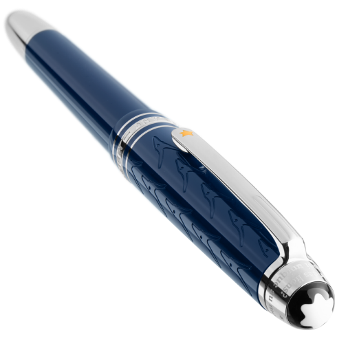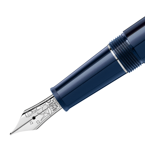 La pluma estilográfica Meisterstück Le Petit Prince Classique en resina preciosa azul profundo está inspirada en el cielo azul oscuro del universo. La tapa, fresada con un patrón de cara de zorro, revela una oración del libro Le Petit Prince y está coronada con el emblemático emblema. El anillo central de los tres anillos recubiertos de platino presenta la marca Montblanc y el clip está adornado con una estrella lacada amarilla. El instrumento de escritura está acabado con una punta bicolor Au 585/14 K hecha a mano con el Petit Prince y el zorro.