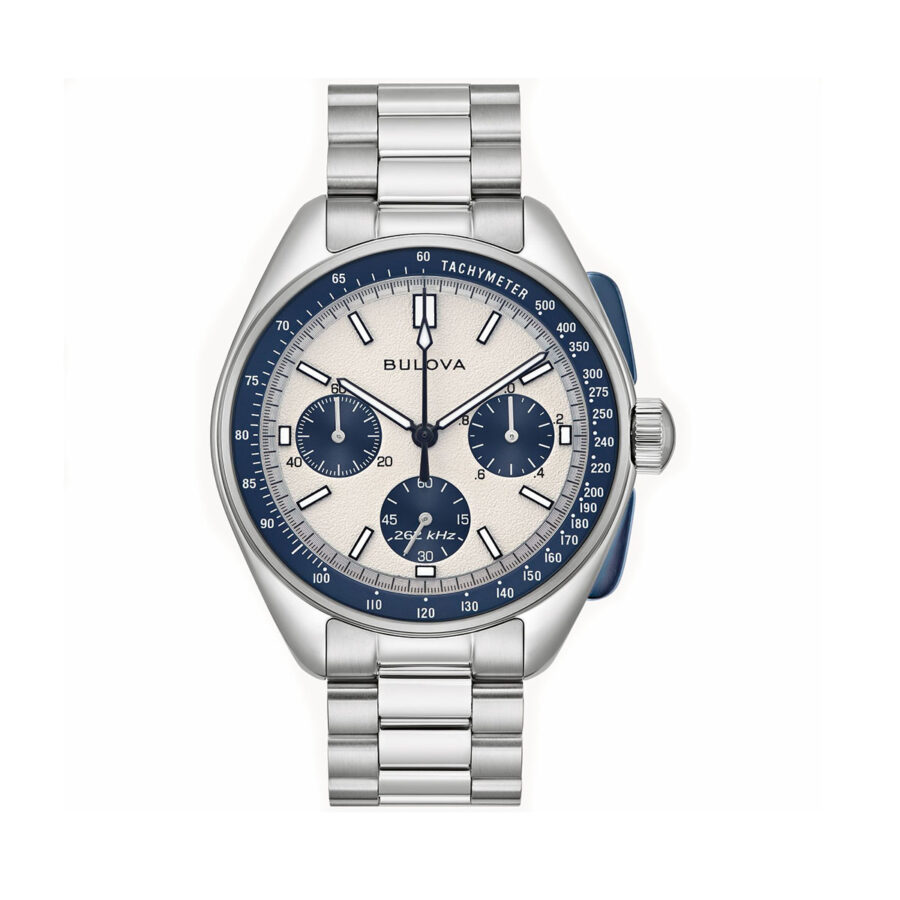 El cronógrafo Lunar Pilot presenta la misma caja de acero inoxidable plateado de 43,5 mm que el cronógrafo Bulova original. Los pulsadores delgados del cronógrafo azul y una corona con el logotipo del diapasón de Bulova se ubican a las 3 en punto. Debajo del cristal de zafiro plano, la esfera del cronógrafo de seis manecillas tiene un diseño de panda azul y plateado, con un anillo de taquímetro azul y el nombre retro de Bulova.