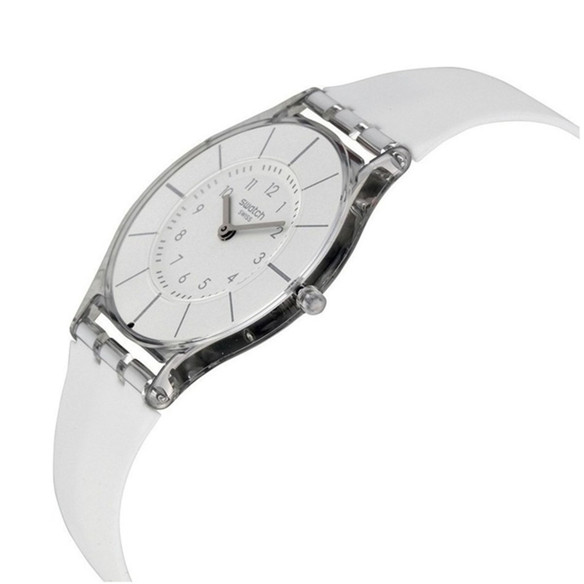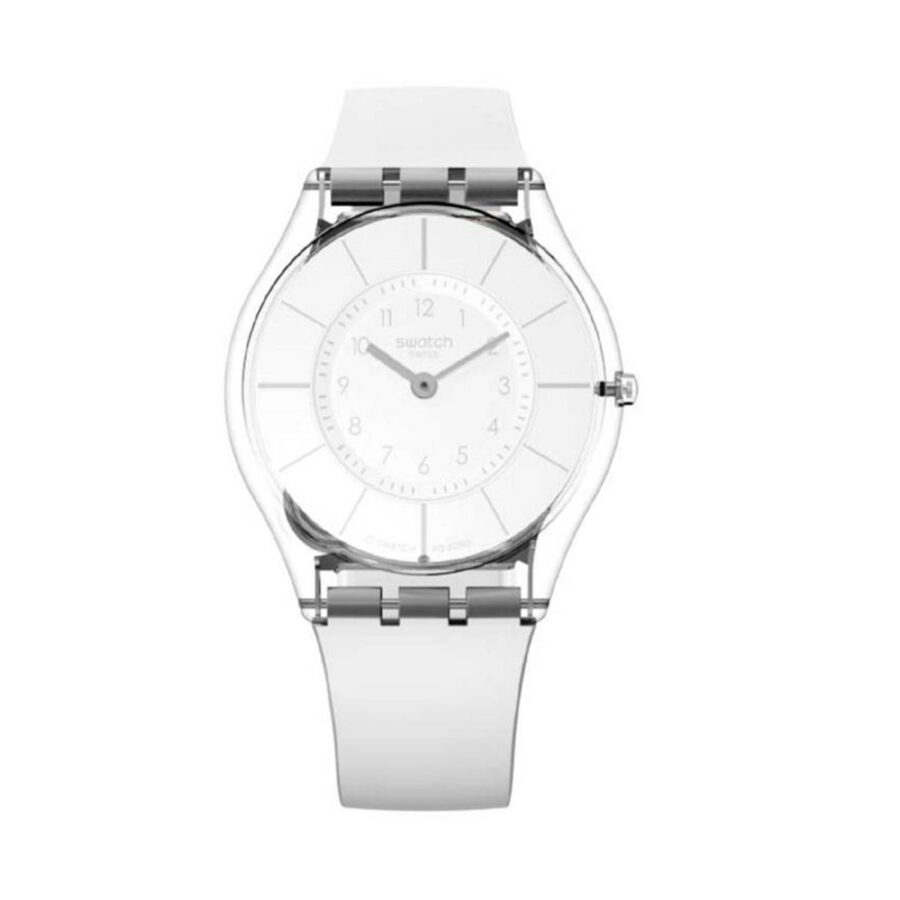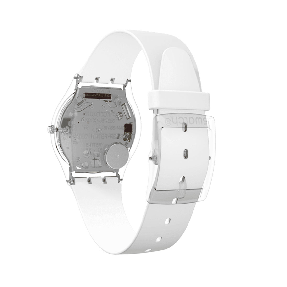 El reloj SWATCH Classiness SFK360 es un diseño a la última con su correa de silicona blanca ultradelgada y su caja blanca transparente. En la esfera blanca destacan los llamativos índices plateados.