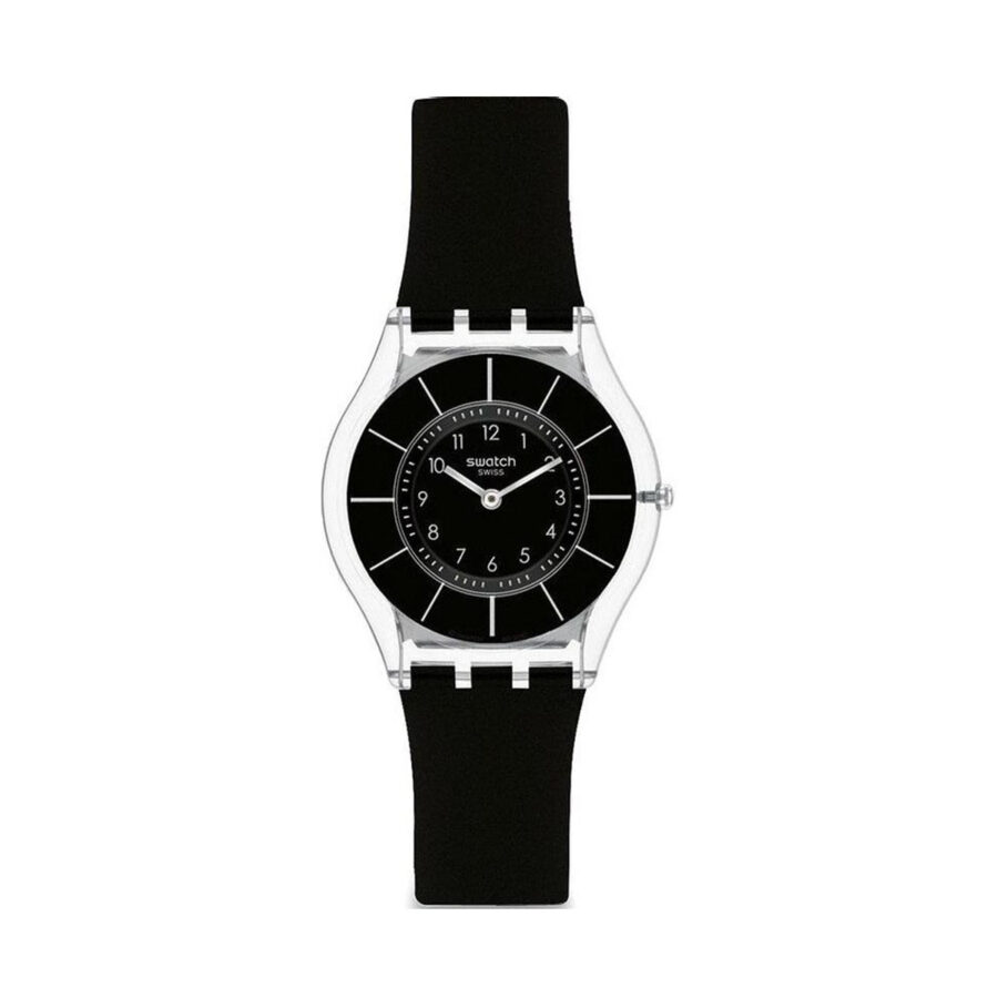 El reloj SWATCH Black Classiness SFK361 es un diseño a la última con su correa de silicona negra ultradelgada y su caja blanca transparente. En la esfera negra destacan los llamativos índices plateados.