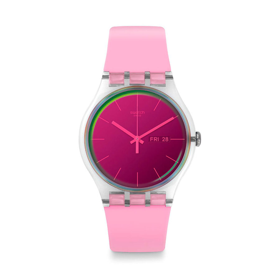 Presentamos otro maravilloso reloj de pulsera para hombre analógico diseñado y fabricado por Swatch. Viene con una correa de plástico Rosa y una caja de plástico complementada con una esfera Espejo Fucsia.