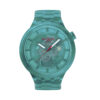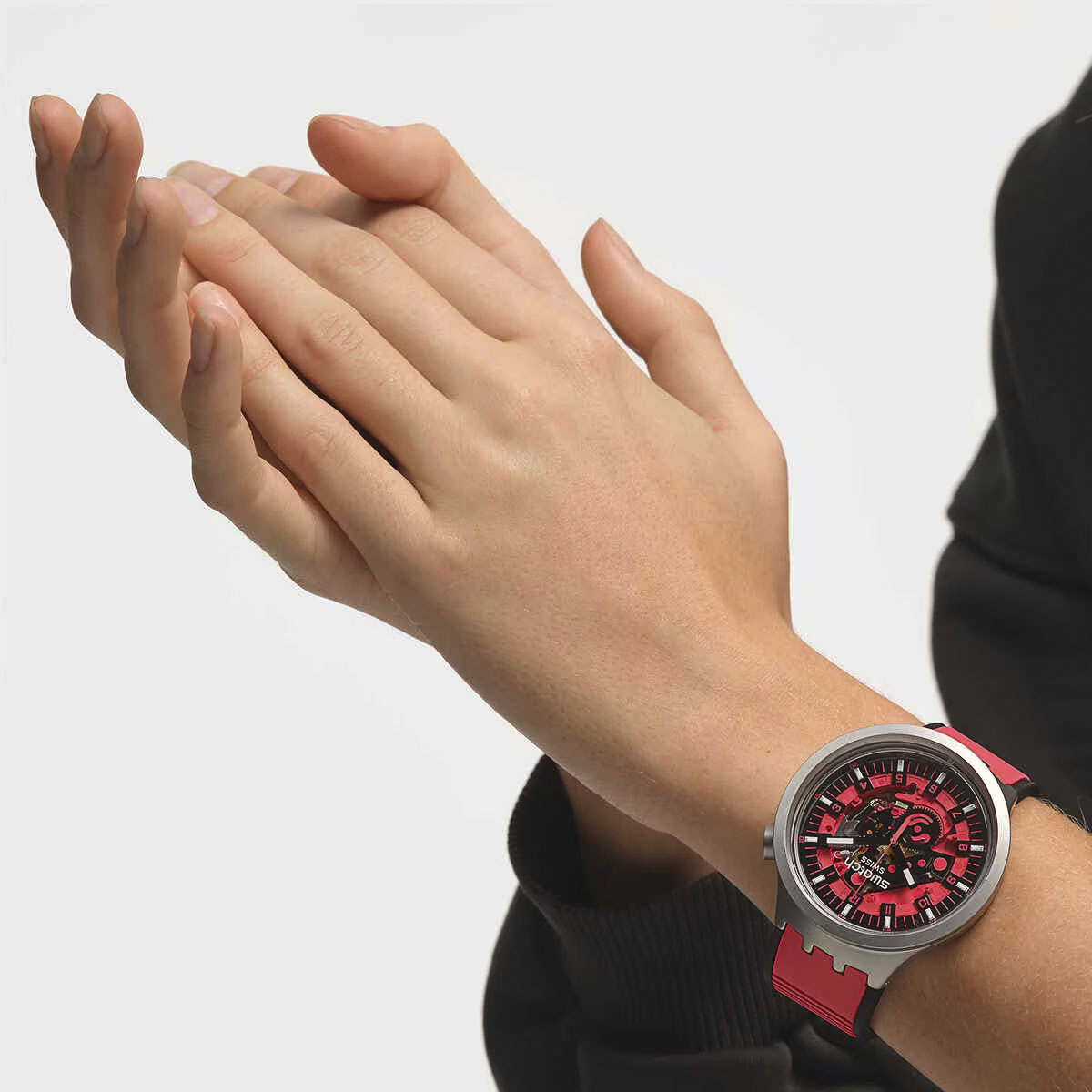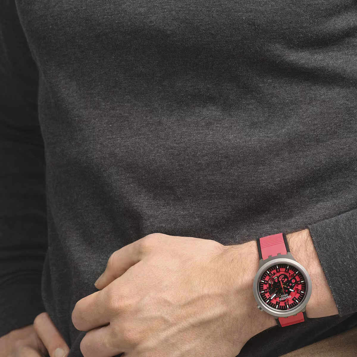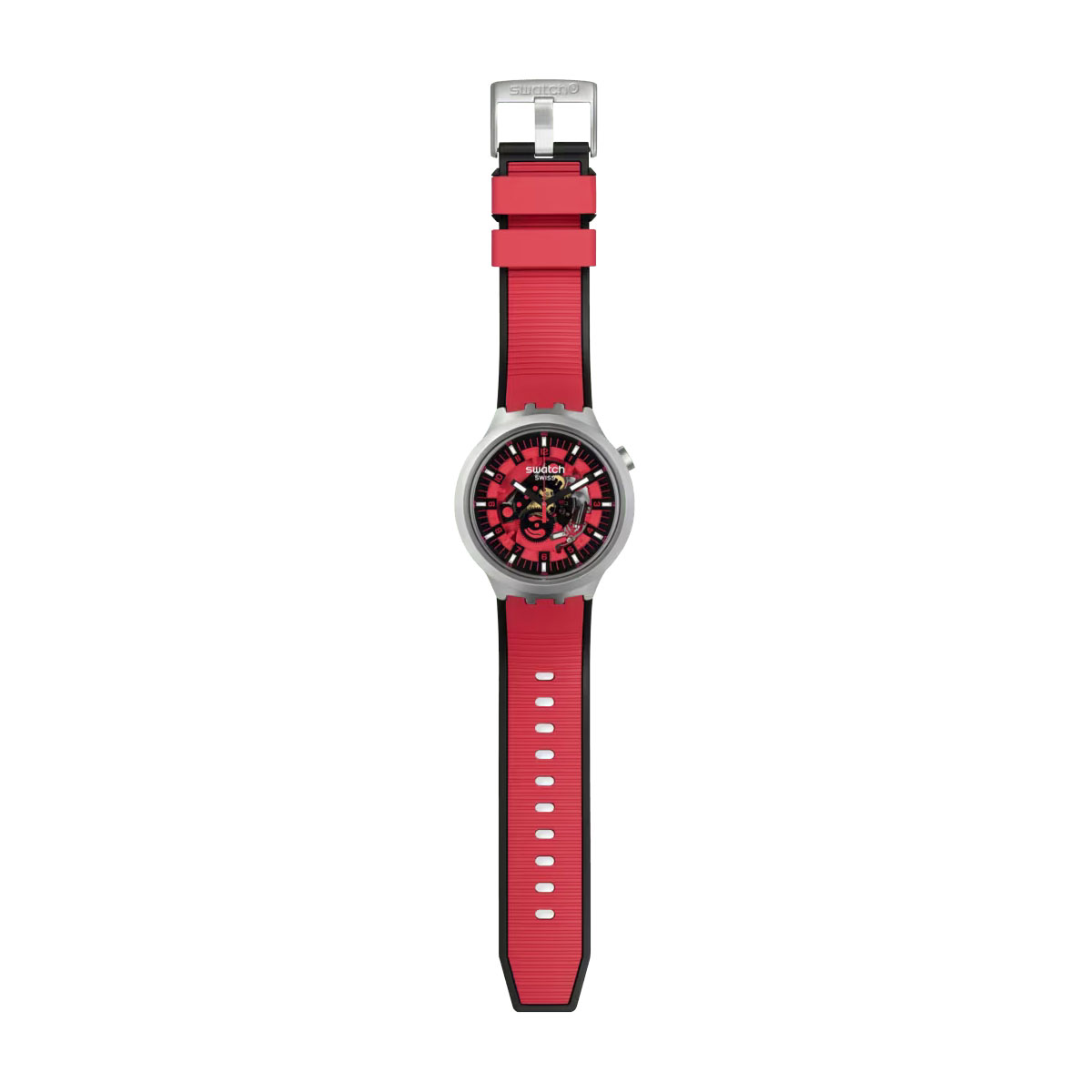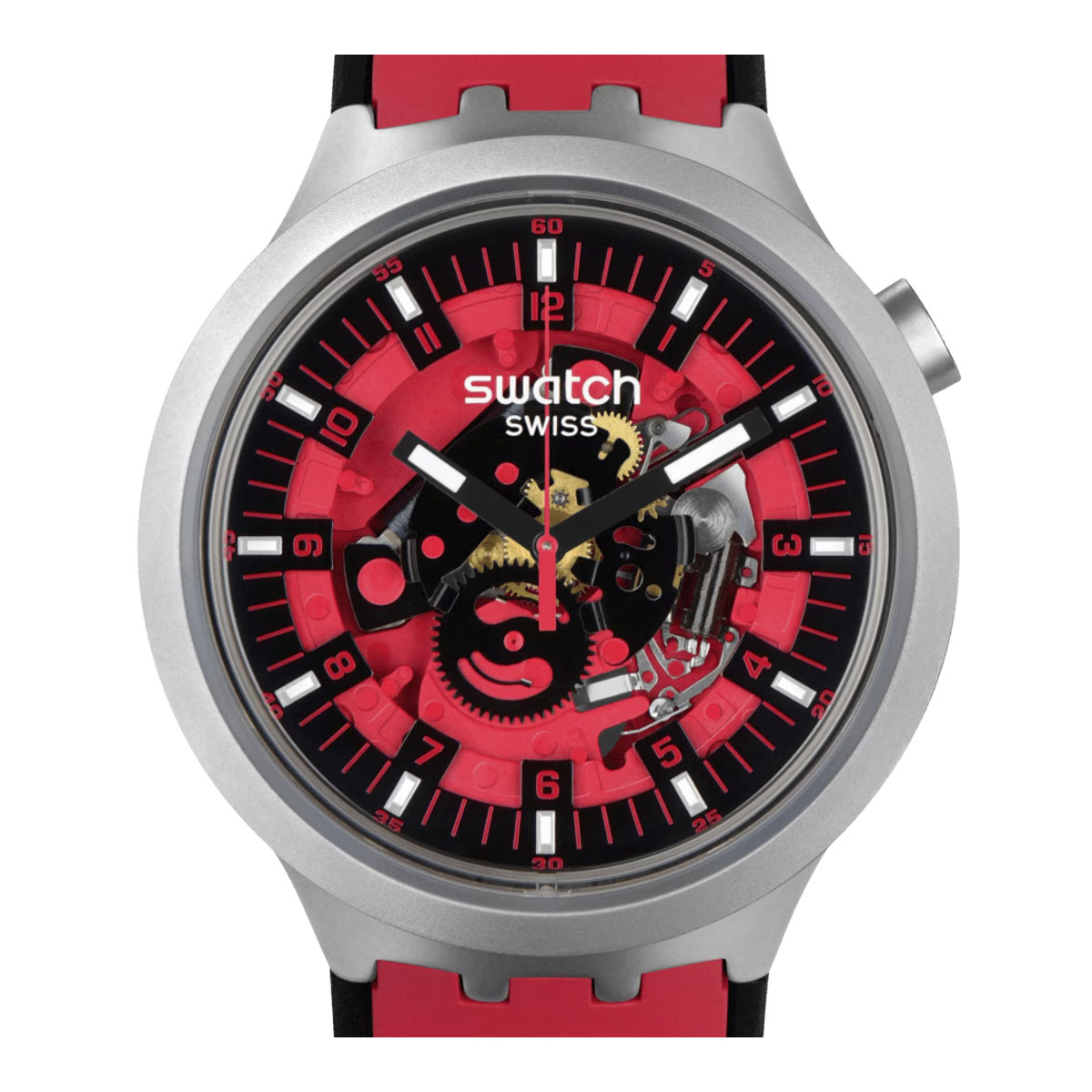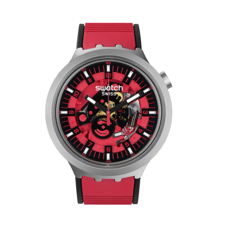 Este reloj de gran tamaño incluye una esfera negra abierta con manecillas que brillan en la oscuridad en una caja de metal pulido. Este reloj rojo de gran tamaño incluye una resistente correa estructurada y dos trabillas.