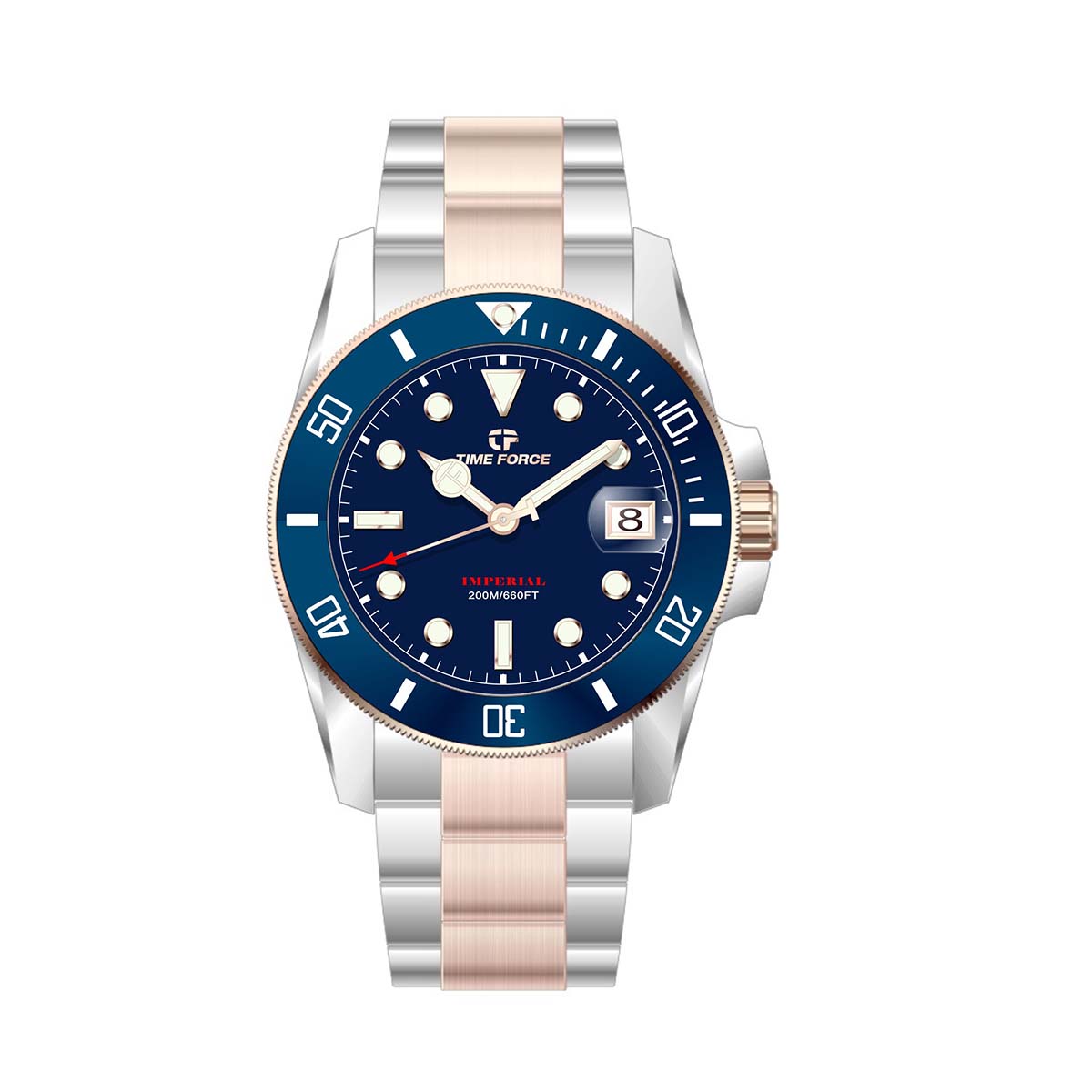 Reloj Time Force Imperial TF5023M-01MAR para hombre, caja en acero inoxidable . Cuenta con calendario y segundero montado sobre un tablero azul, y un bisel en acero  azul, pulso en acero inoxidable y trapiento PVD oro rosado.