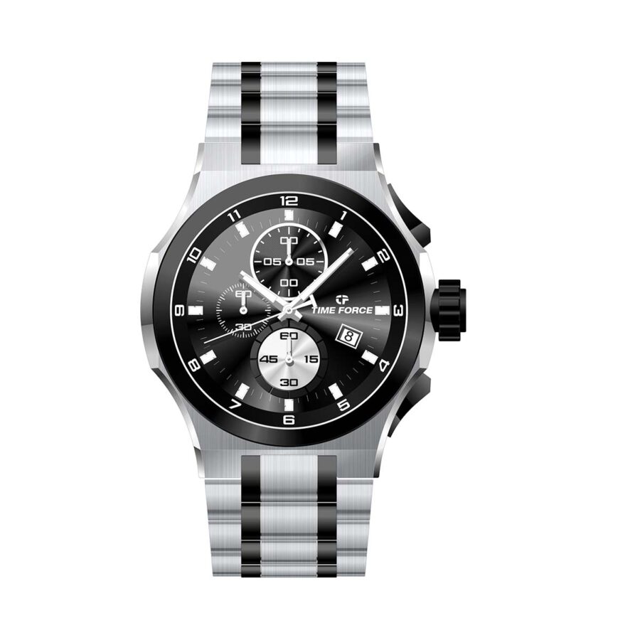 Reloj para Mujer, caja en acero inoxidable . Cuenta con calendario y segundero montado sobre un tablero negro, y un bisel en acero PVD negro, pulso en acero inoxidable y trapiento PVD negro.